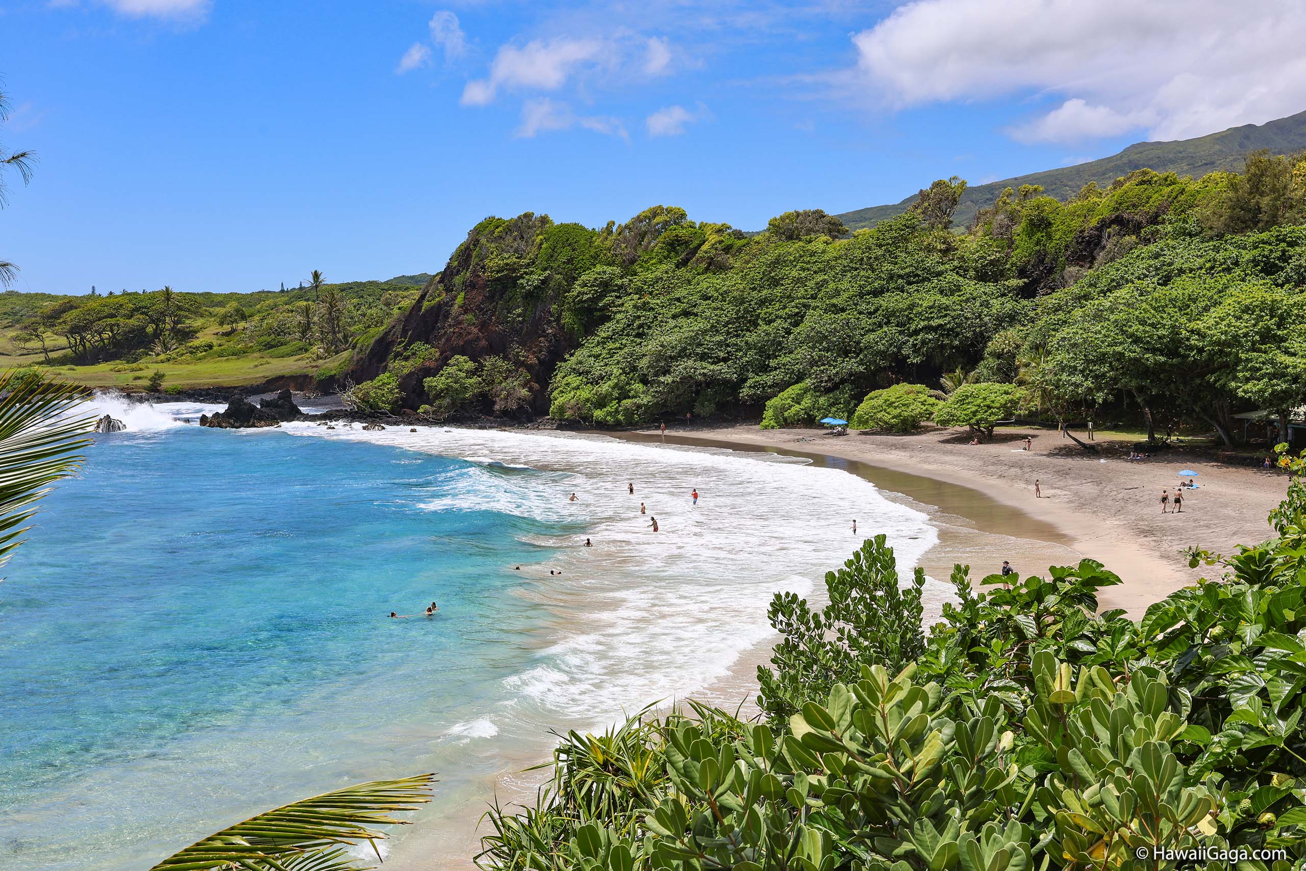 Near Hana, a beautiful crescent-shaped beach with a unique remote charm, surrounded by lush greenery.